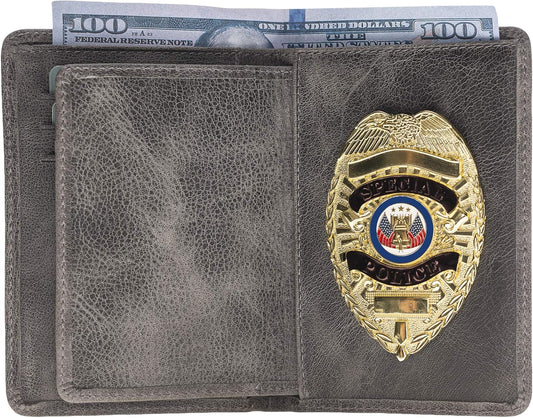 Police Badge Wallet All Leather Universal Fit-Charcoal Gray for Pin & Clip Back Badges