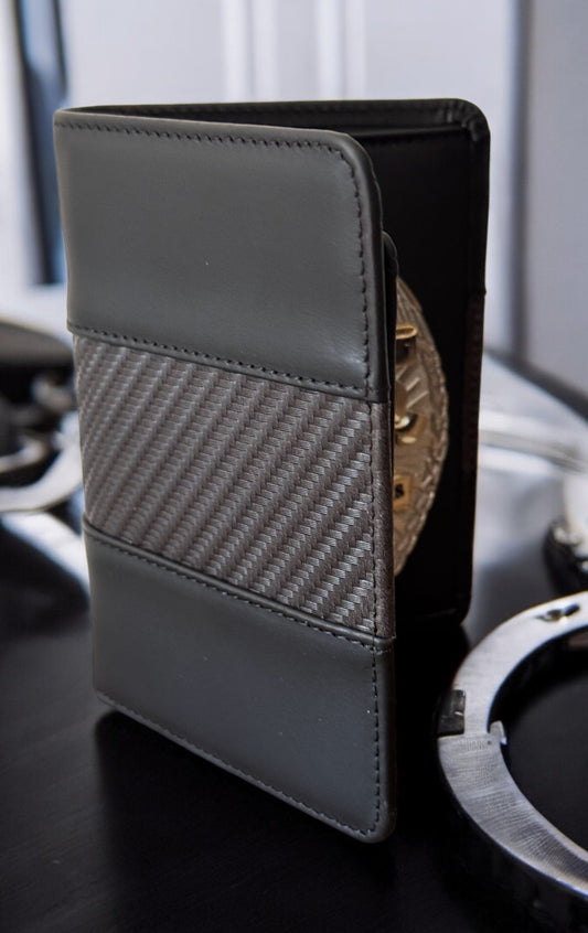Police Badge Wallet All Leather Universal Fit- Carbon Black Accent Leather-For Pin Back Badge