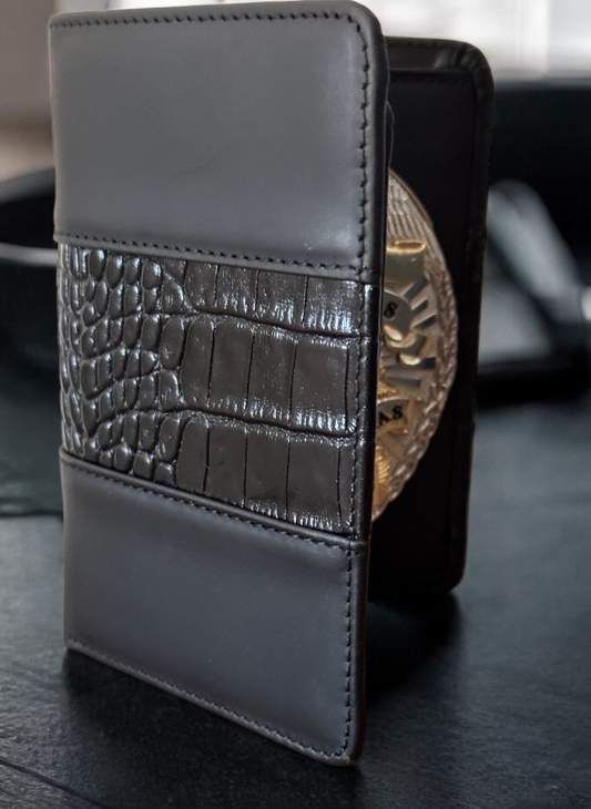 Police Badge Wallet All Leather Universal Fit-Black Croc Accent-For Pin Back Badges
