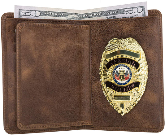 Saddle Brown Police Badge Wallet All Leather Universal Fit for Pin Back & Clip Back Badges