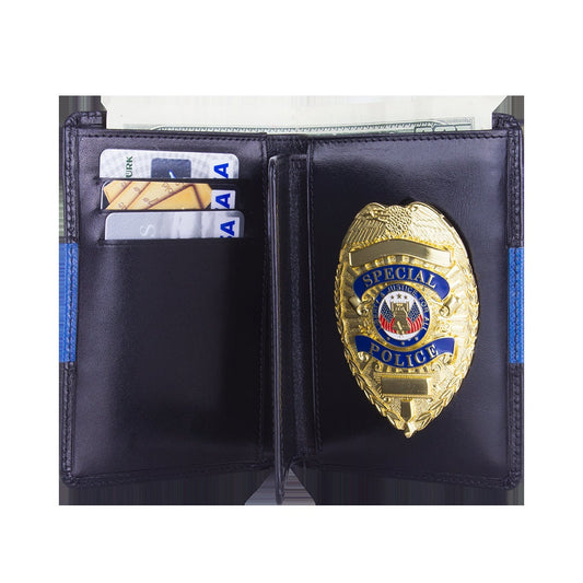 Police Badge Wallet Black with Thin Blue Line, All Leather, For Pin and Clip Back Badges