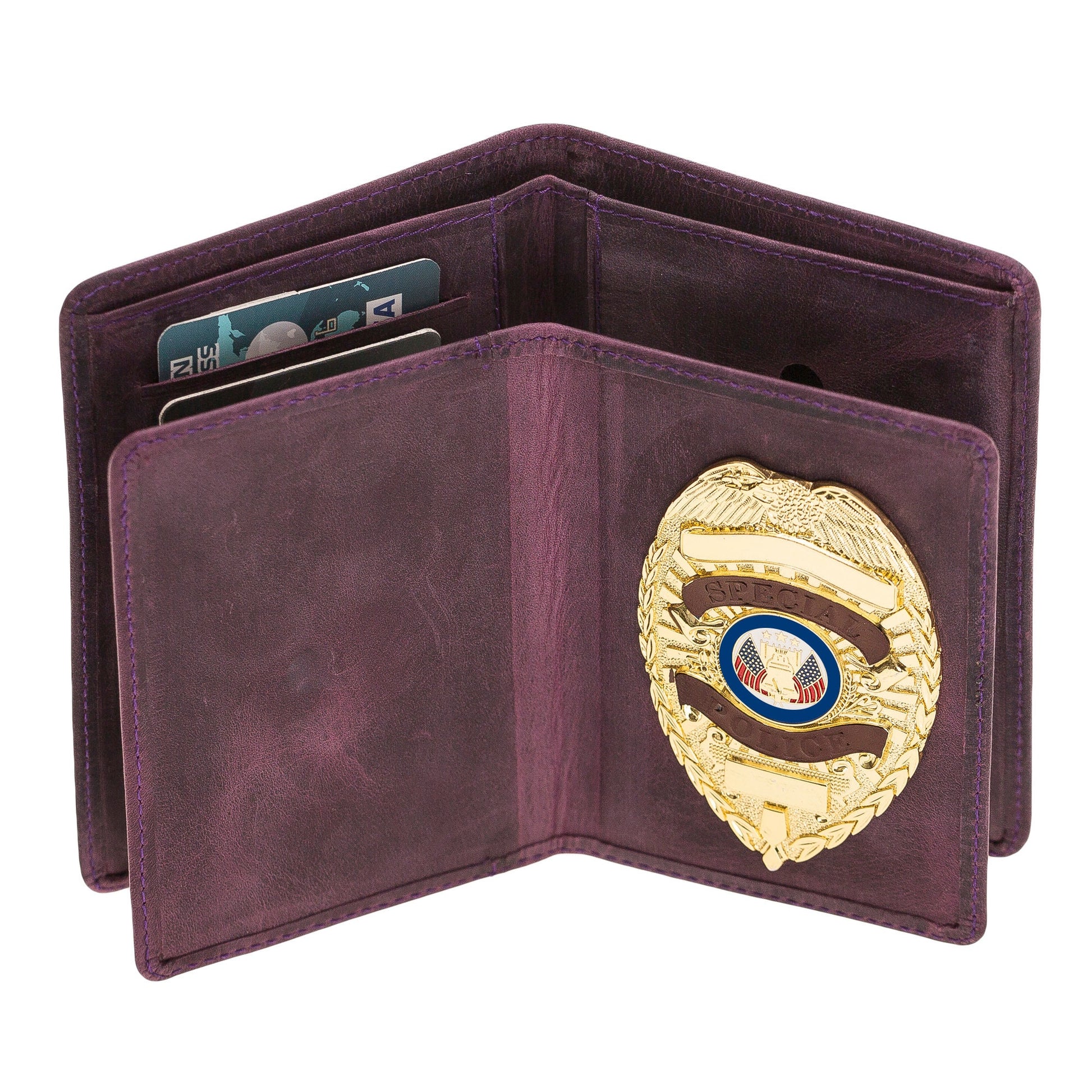 Police Badge Wallet Dark Purple, All Leather, For Pin and Clip Back Badges